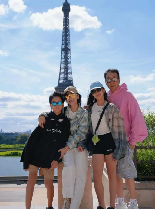 8月5日,48岁苗圃在社交平台晒一家四口全家福,先后打卡埃菲尔铁塔和凯旋门,这次她还难得大方晒出老公陈义红,一家四口戴墨镜合照,苗圃搂儿子,陈义红搂女儿。
